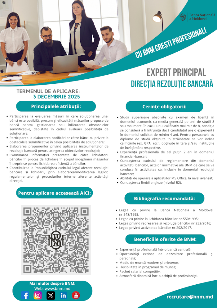 Expert(ă) principal(ă) al/a Secției Rezoluție bancară al/a Direcției Rezoluție bancară